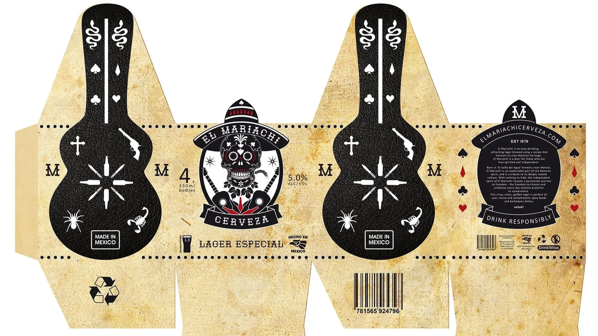 wheat, hops and guitar imagery incorporated within the design. Collateral included: box package, bottle labels, bottle caps label and bottle neck labels.