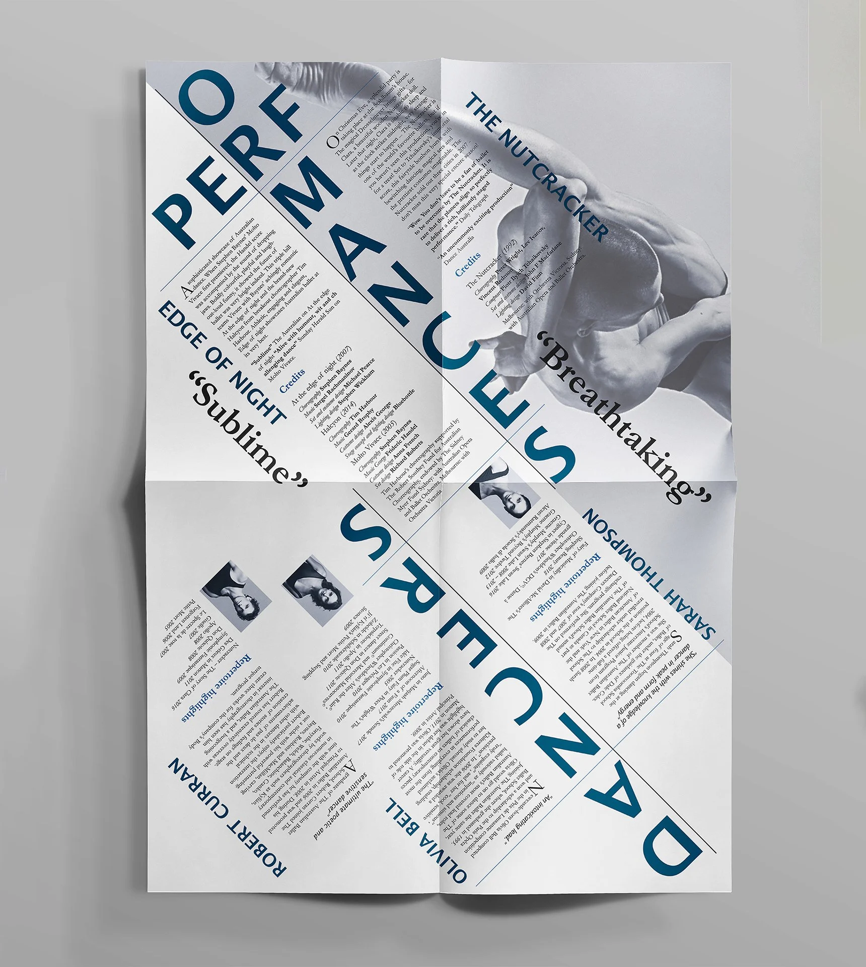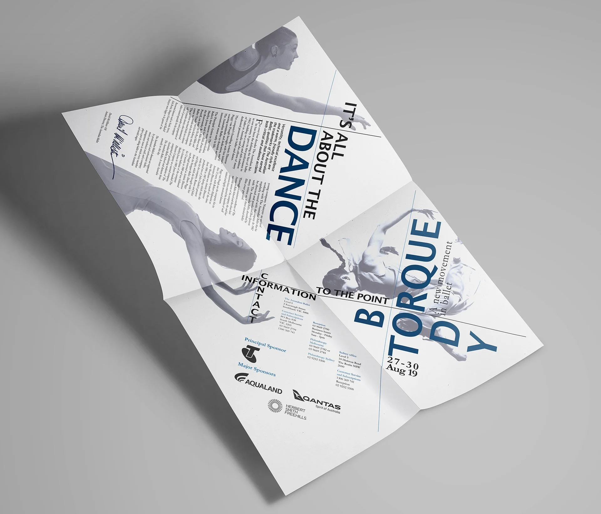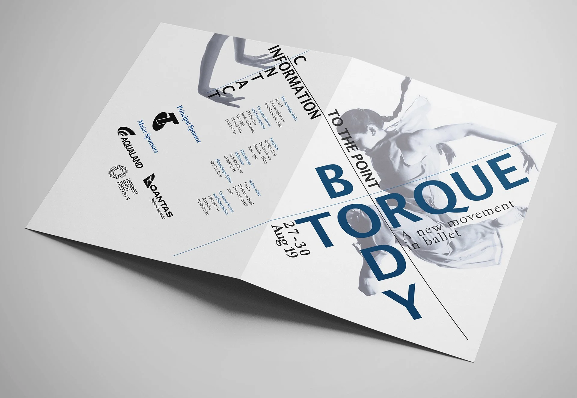 Brief was to create a fold-out pamphlet for the Australian Ballet Body Torque theatre program. The theme for the program was based around body movement and motion. Main design focus was to use the dancers poses as a base for the grid layouts.